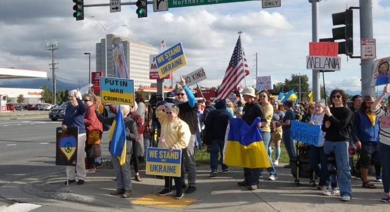 «путін не зупиниться на Україні», — йшлося на ще одному плакаті, що натякало на занепокоєння деяких жителів Аляски тим, що путін спробує відновити контроль над Аляскою, яку росія продала США у 1867 році.