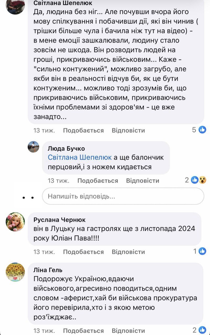 Люди підозрюють, що він шахрай. Волонтерка Лариса розповіла: намагалася допомогти йому з візком, але натомість отримала грубість, коли попросила документи. Інші свідки запевняють, що чоловік ніколи не служив у війську, а приїхав із Сумщини «на гастролі».