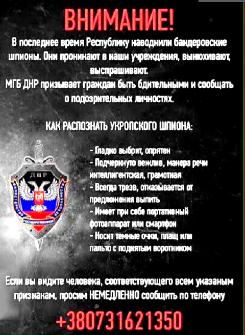 Нещодавно «Мид России» розмістив у своєму твіттер-акаунті інструкцію, яка має стати допомогою для місцевих жителів у виявленні українських шпигунів. На думку розробників, таких «Бандерівських шпигунів» на Донбасі зараз дуже багато і їх потрібно виявляти і затримувати. У листівці йдеться про необхідність негайного повідомлення відповідним службам щодо виявлення осіб, які підпадають вказаним у листівці ознакам.