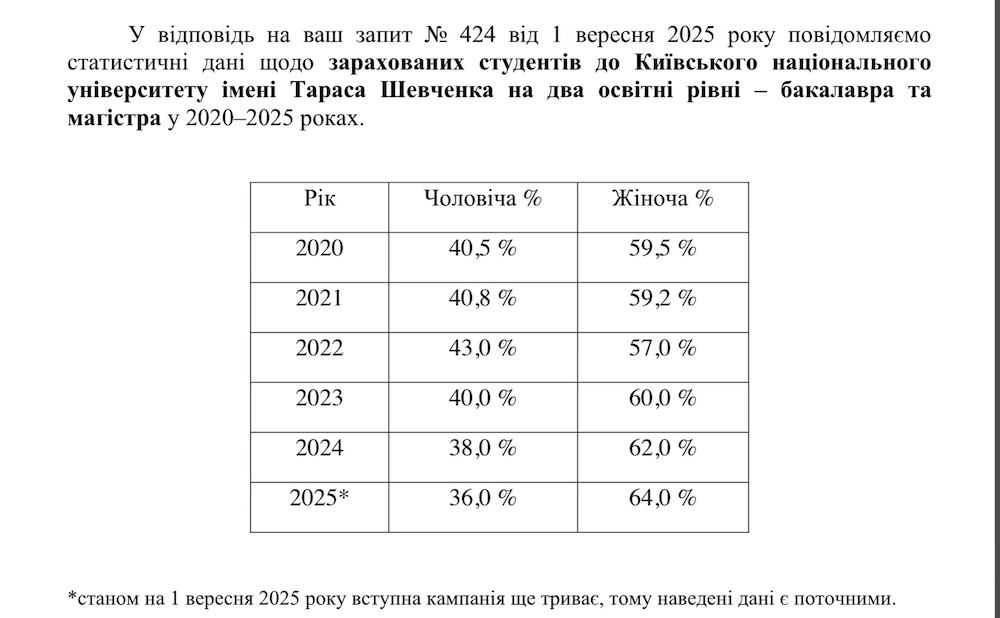 У КНУ імені Тараса Шевченка дані надали у відсотках. У 2025 році вони зарахували до вступу на бакалаврат та магістратуру 36% хлопців і 64% дівчат. І якщо кількість зарахованих дівчат за останні п’ять років поступово зростала, то хлопців серед вступників із 2022 року ставало дедалі менше. Для порівняння: у перший рік повномасштабної війни хлопці становили 43% вступників.
