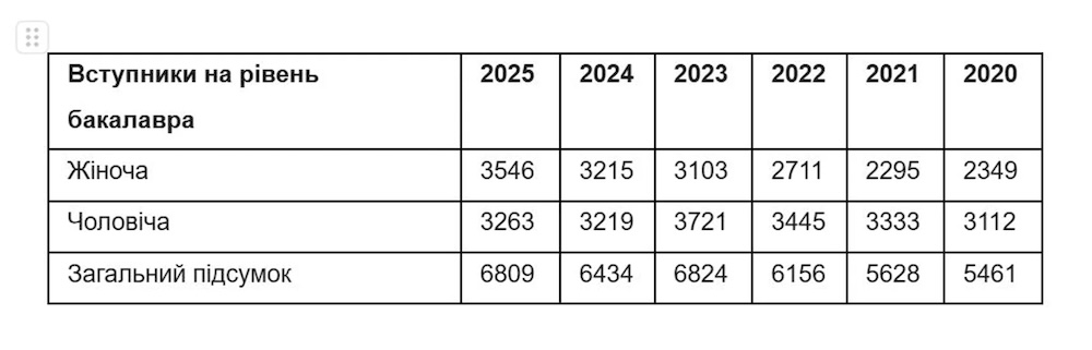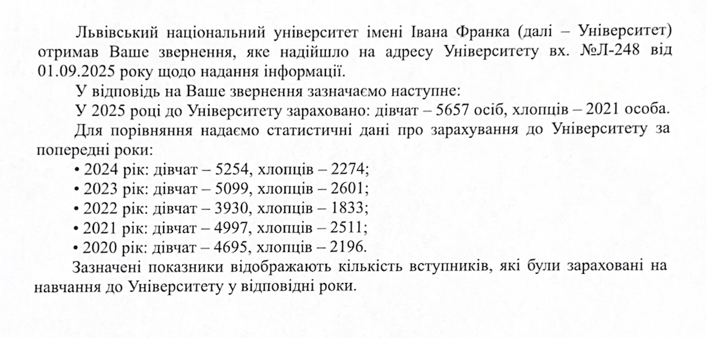 Так, до ЛНУ імені Івана Франка 2025 року зарахували 2021 хлопця та 5657 дівчат. Для порівняння, 2024 року до університету прийшли навчатися 2274 хлопці та 5254 дівчини. Упродовж останніх п’яти років ці показники залишалися майже незмінними, окрім 2022-го, коли зарахували найменше хлопців — 1833. Хоча вже наступного року цей показник зріс до 2601.
