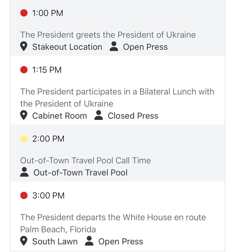 Початок зустрічі буде відкритим для преси, а за 15 хвилин після цього президенти проведуть переговори у форматі «двостороннього обіду». Згідно з графіком, о 15:00 за Вашингтоном (22:00 за Києвом) Трамп має вилітати до Флориди.