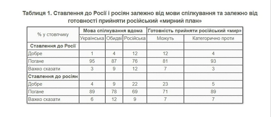 Згідно з опитуванням, серед російськомовних українців лише 12% добре ставляться до росії та 22% добре ставляться до росіян. Водночас 76% погано ставляться до росії й 69% погано ставляться до росіян.