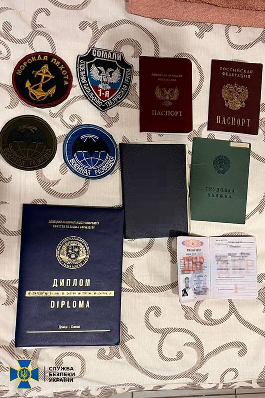 Під час обшуків в готельному номері фігуранта виявили паспорти рф та «днр», а також «військовий квиток» та шеврони збройних формувань країни-агресора.
