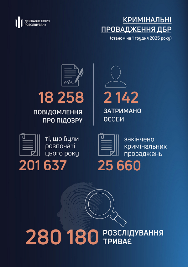 Слідчі Державного бюро розслідувань за січень – листопад 2025 року завершили досудове розслідування та направили до суду понад 7 029 обвинувальних актів щодо 7 511 осіб.