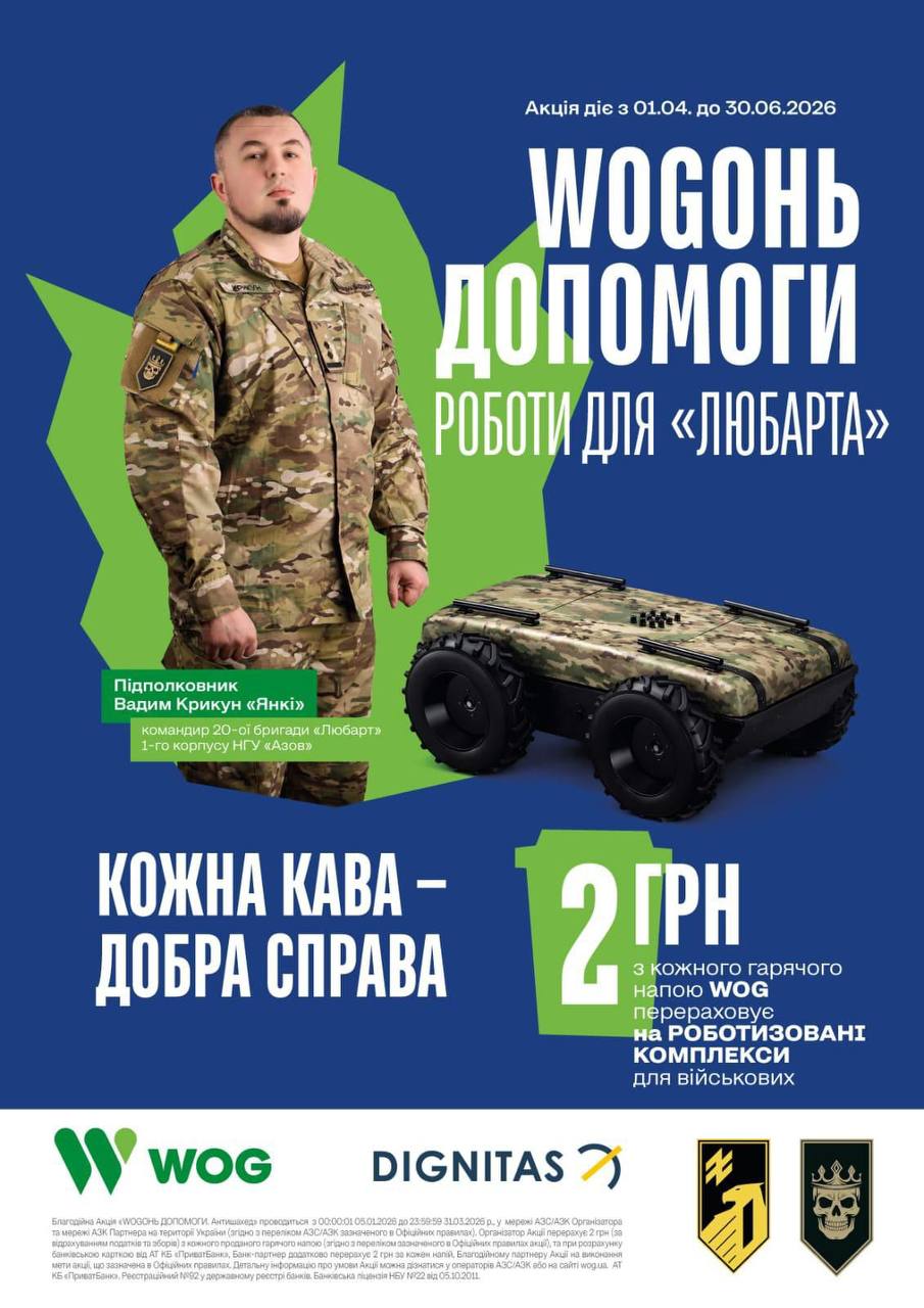 З 1 квітня кожен, хто насолоджуватиметься будь-яким гарячим напоєм у мережі АЗК WOG, автоматично стає учасником благодійної ініціативи. Компанія спрямує 2 гривні з кожного проданого горнятка до БФ «Дігнітас» на придбання наземних роботизованих комплексів для 20-ої бригади оперативного призначення «Любарт» 1-го корпусу НГУ «АЗОВ».