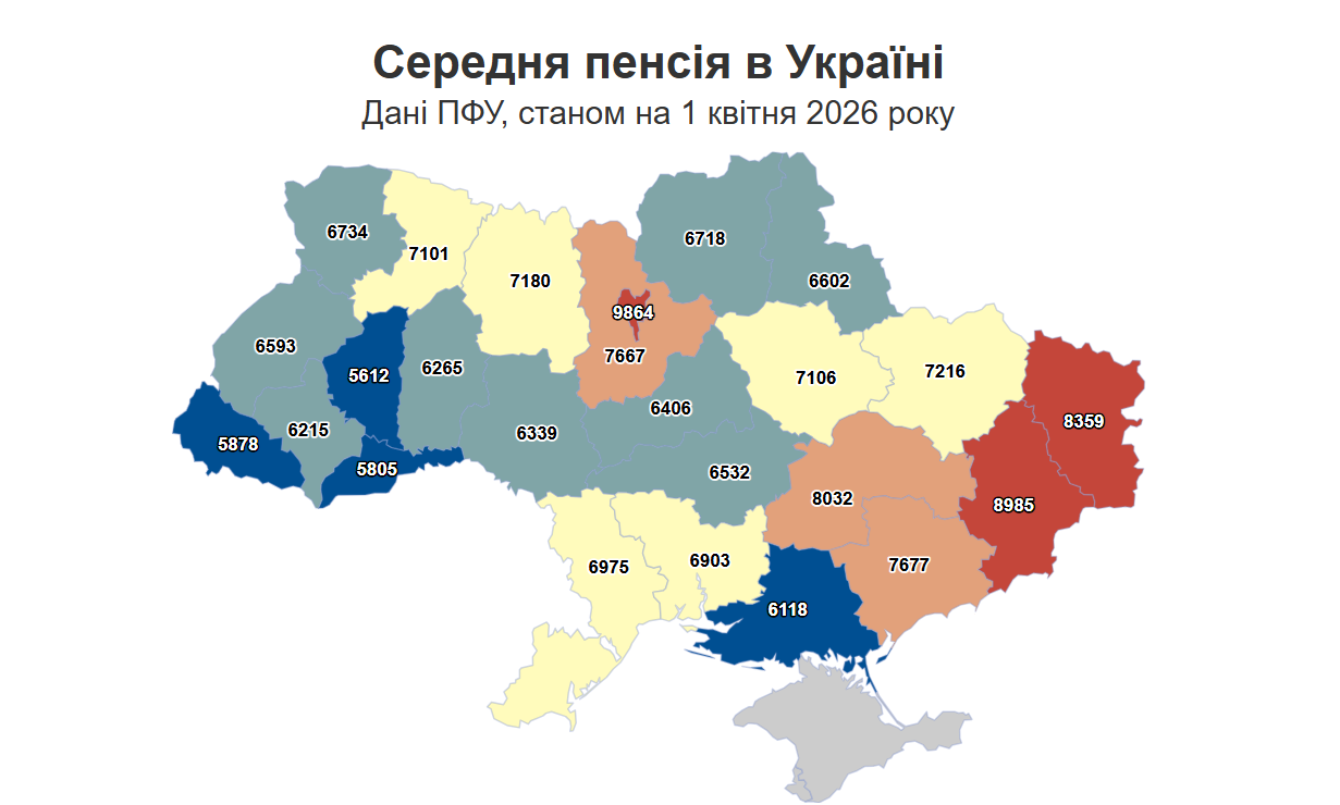 Найвищі пенсії традиційно у Києві — в середньому, 9 864 гривні. Найнижчі — на Тернопільщині, де середня виплата становить 5 612 гривень. Загалом лише у 8 регіонах пенсії дотягують до середнього рівня або перевищують його.