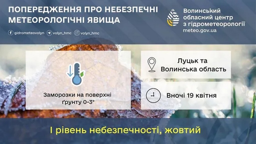 Так, вночі та вранці 19 квітня очікуються заморозки на поверхні грунту: в Луцьку 0-2°, по області 0-3°.