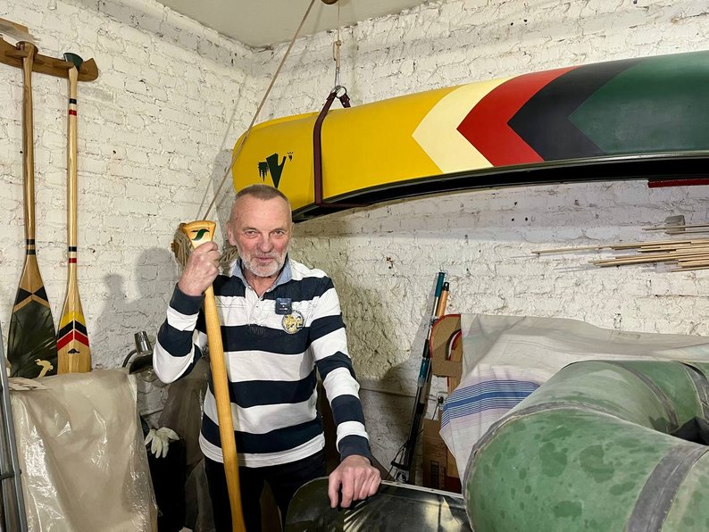 "Воно називається рейкове каное, бо воно виготовлено було з таких рейочок. Це дерево осика. Потім воно покривається склотканиною, на епоксидці, на посиленій смолі, потім фарбується, потім зверху яхтовим лаком. Я зробив це для молодшої внучки. От вам різниця — це каное, що я робив з фанери, коротше, бо це 4,20 має довжину. Це 37 кг важить, а це важить 27 кг", — каже майстер.