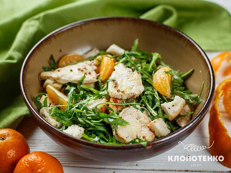 - У салатник викладіть руколи та шматочки мандаринів без кісточок.