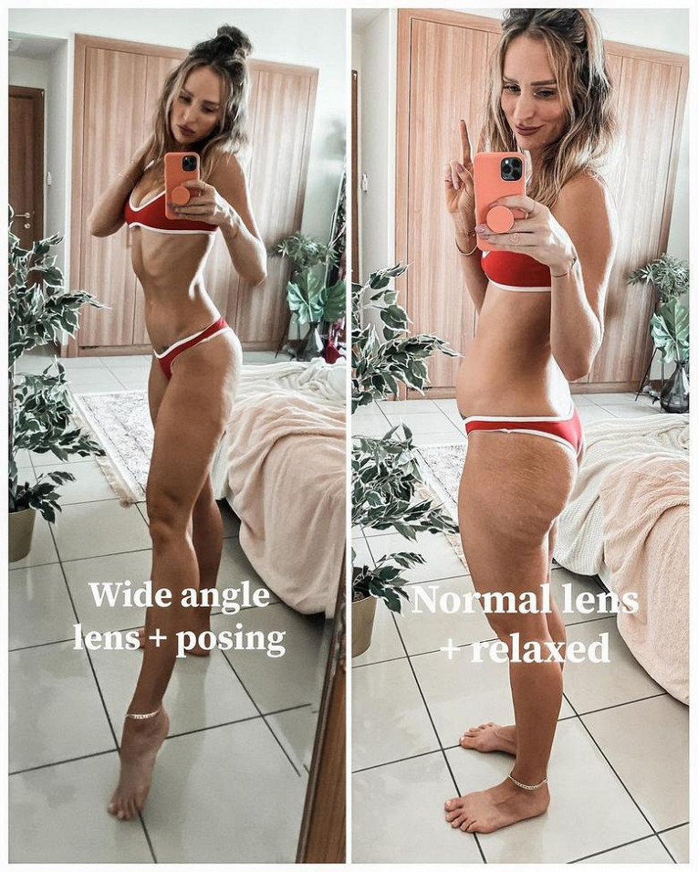 Поруч для порівняння вона завжди ставить розслаблені і необроблені кадри - з веселою і розслабленою усмішкою. Вона нагадує, що інстазіркам навіть не треба фотошопити свої селфі, щоб домогтися супердовгих ніг – досить витягнутих в потрібну сторону ніг і роботи камери телефону, яка, як правило, має ефект ширококутної, стягуючи зображення до центру.