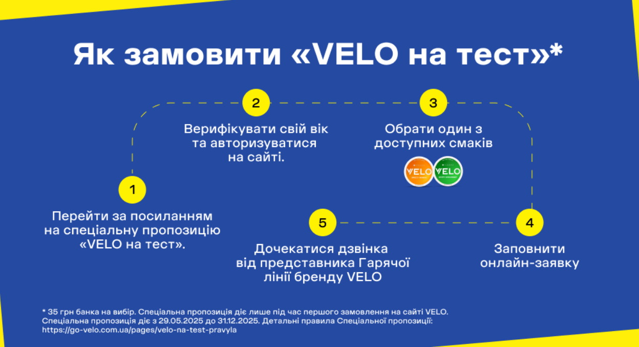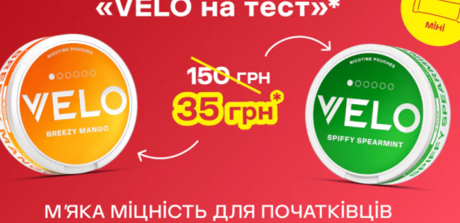 На офіційному сайті go-velo.com.ua з 29 травня до 31 грудня 2025 року діє спеціальна пропозиція, що дозволяє отримати одну банку VELO за спеціальною мінімальною роздрібною ціною 35 гривень. У рамках цієї пропозиції повнолітній споживач, який заповнив спеціальну форму на сайті go-velo.com.ua та оформив заявку на спеціальну пропозицію, може купити VELO в одному із двох смаків у форматі М’якої міцності.