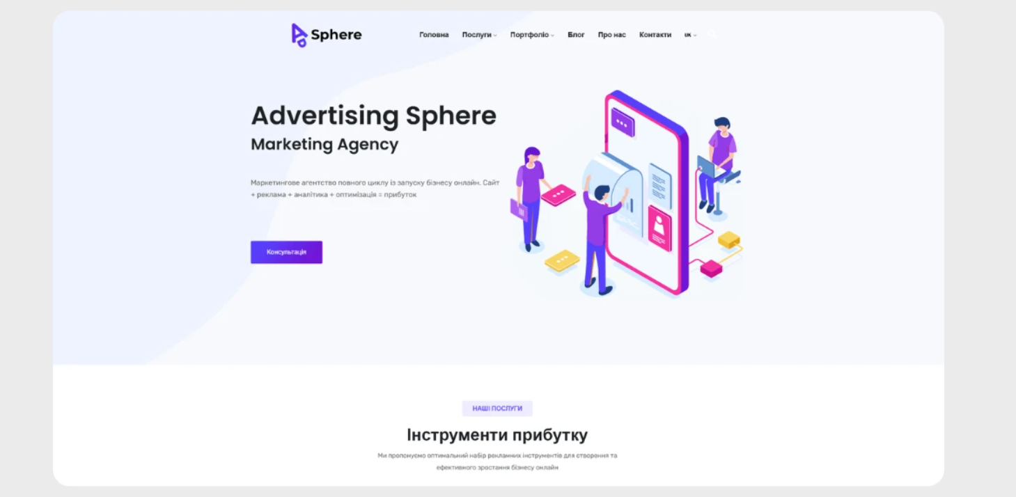 Ad_Sphere позиціонує себе як "рекламна сфера". Вона поєднує найефективніші інструменти для запуску та масштабування бізнесу в інтернеті. Вони гарантують результат, працюють на прибуток, а звіти надають прозорі та зрозумілі, без складних маркетингових термінів.