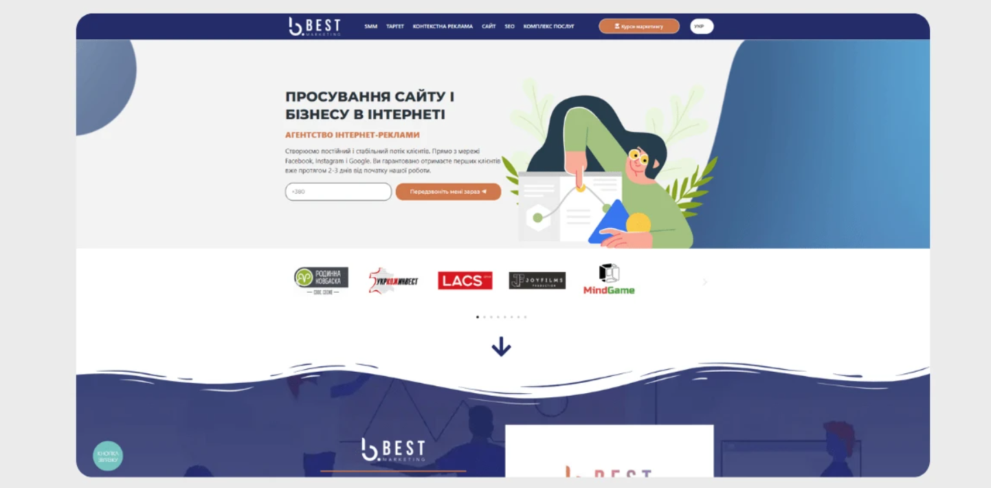 Best Marketing — це агенція інтернет-реклами. Вони створюють стабільний потік клієнтів з Facebook, Instagram і Google. Компанія гарантує перших клієнтів протягом 2-3 днів. Вони мають досвід роботи у 50+ різних сферах. Агентство пропонує клієнтам саме комплексний інтернет-маркетинг.