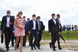 Розпочався захід традиційно — оглядом об'єкту. Володимир Зеленський та його колеги в супроводі посадовців, чиновників та директора компанії "Інвестор" Андрія Разумовського обійшли будівлю під прицілом фотокамер. А от в середину медійників не пустили.