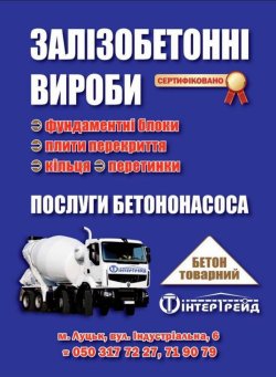 Підприємство «Інтертрейд» вже 16 років займається виробництвом і реалізацією збірних бетонних та залізобетонних виробів та товарних бетонів.