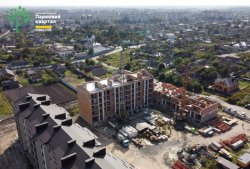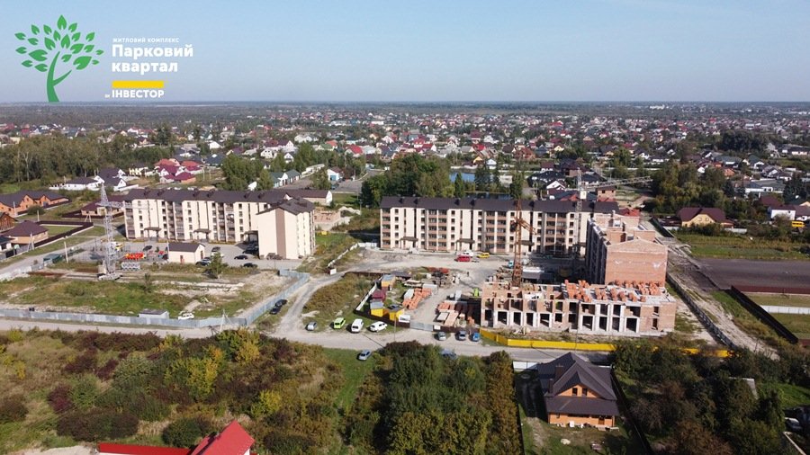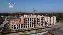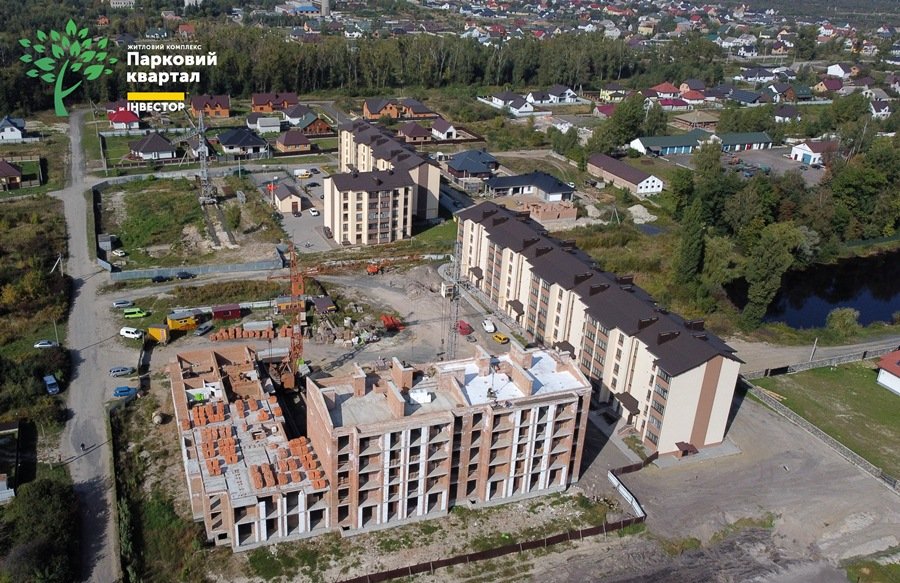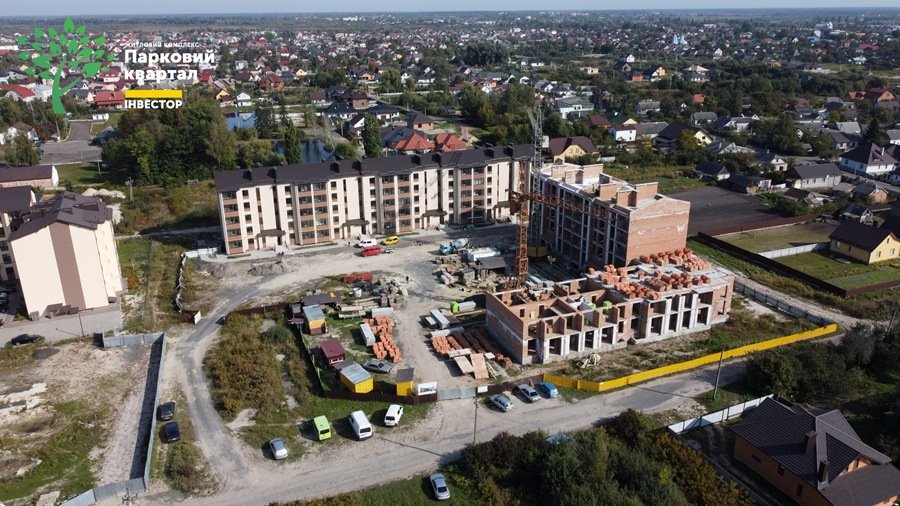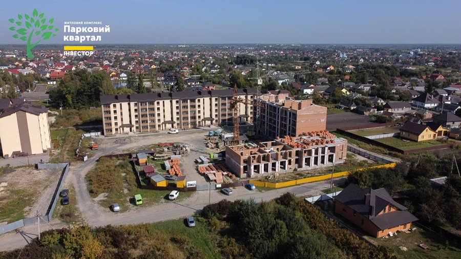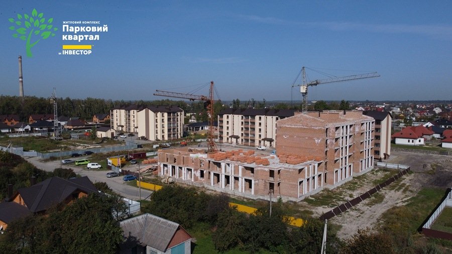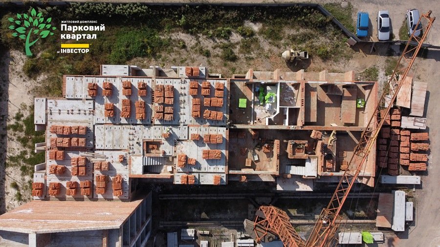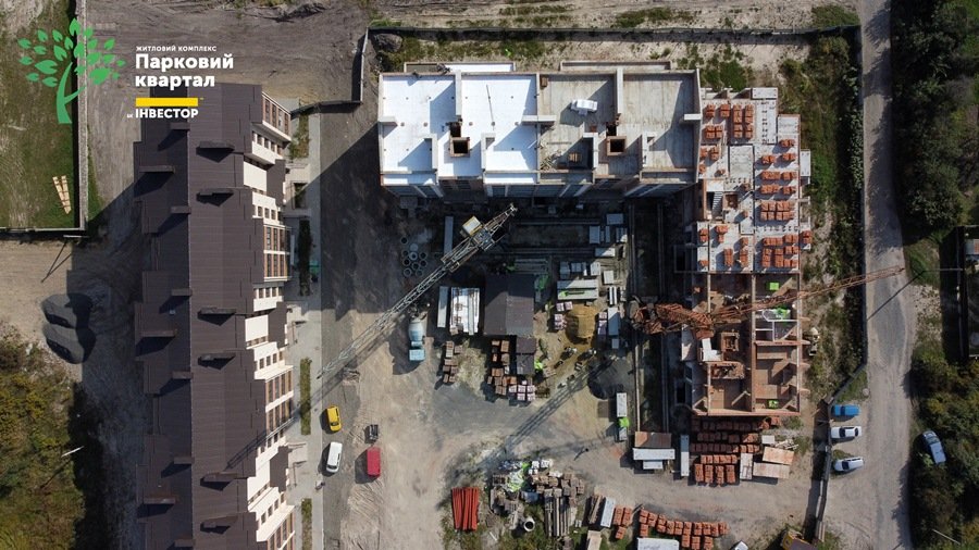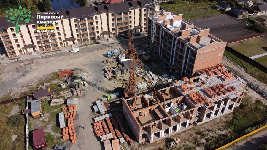У третьому будинку ЖК «Парковий квартал» продовжують будівельні роботи. Частину будинку - уже із горищем, в іншій - мурують зовнішні та внутрішні стіни.