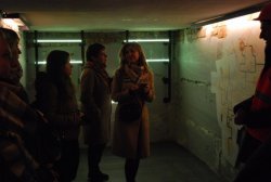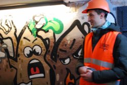 Спочатку ми потрапляємо в зал, де нам розкривають давній секрет якісного пивоваріння. Виявляється, пиво броварня викачує просто із надр землі, обробляє і лише потім напій найвищого гатунку пропонує лучанам. У підземеллі проведені труби від пивонапірної вежі, по яких воно стікає у цехи. І весь цей нелегкий маршрут хмільного напою показано зображенням на стіні.