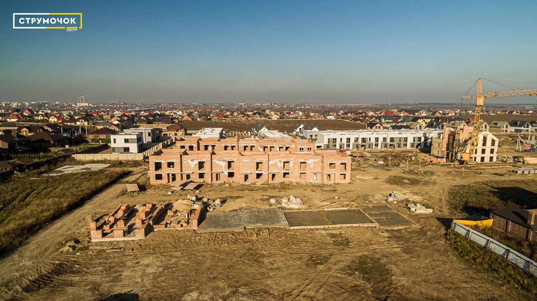 У ЖК “Струмочок” тривають роботи відразу на кількох об'єктах. Завершується будівництво 8 котеджів, стрімкими темпами виростають один за одним 7 секцій таунхаусів, а також готують фундамент для багатоповерхівок ЖК “Амстердам”.