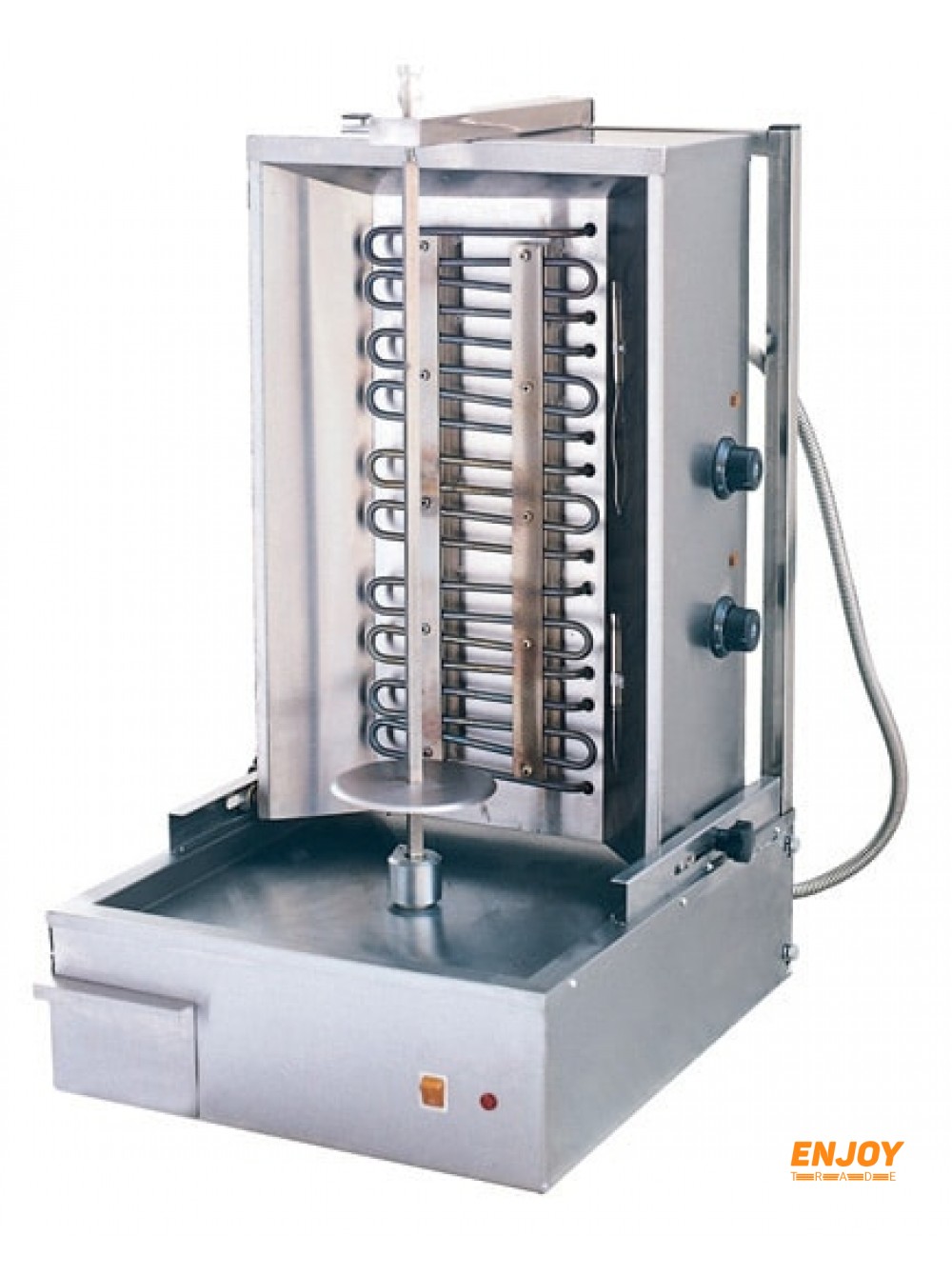 В условиях динамичного развития общепита на улицах города появляются новые точки уличного питания и мини-кафешки. Восполнить потребности покупателей в быстрой вкусной еде способен аппарат для приготовления шаурмы, работающий на газу или от электросети. Внешне он похож на плиту, расположенную вертикально. Его конструкция состоит из вертела для мяса, поддона для соков и жира, ручек для регулировки температуры.
