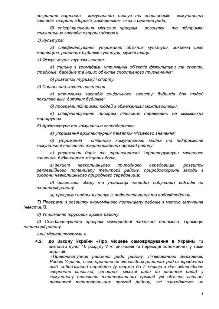 Також УАРОР виступає за доповнення переліку видатків, які можуть здійснюватися за рахунок районних бюджетів, з поміж іншого на освіту, охорону здоров’я, соціальний захист, спорт та туризм.