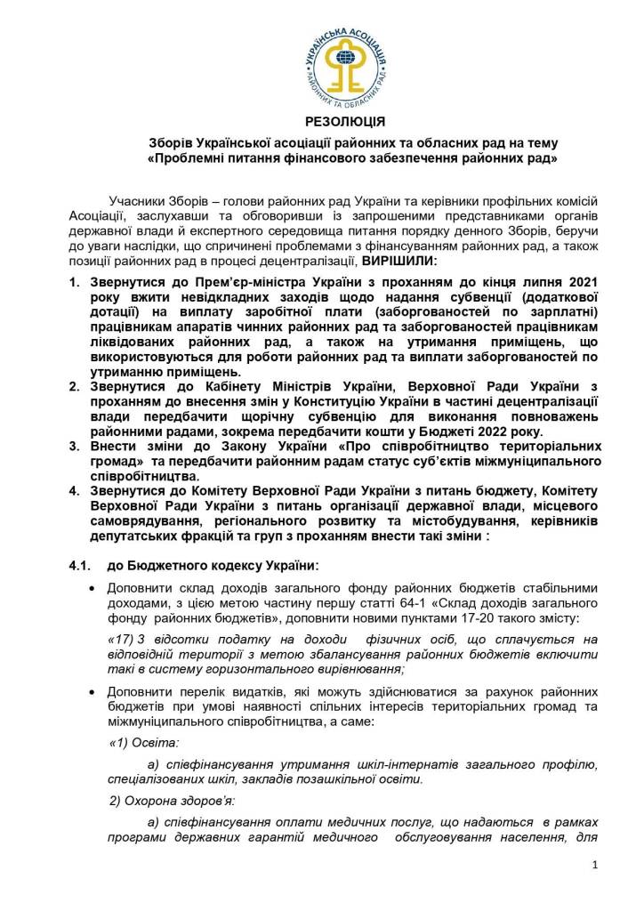 Після редакційних правок Президент Української асоціації районних та обласних рад Сергій Чернов підписав Резолюцію Зборів «Проблемні питання фінансового забезпечення районних рад», яка була підтримана головами районних рад 2 липня.