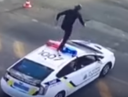22-літній суб’єкт вчинив акт неповаги щодо стражів правопорядку, вирішивши пробігтися по автомобілю патрульних, через що у автівки лопнуло лобове скло і лишилися глибокі вм’ятини на даху.