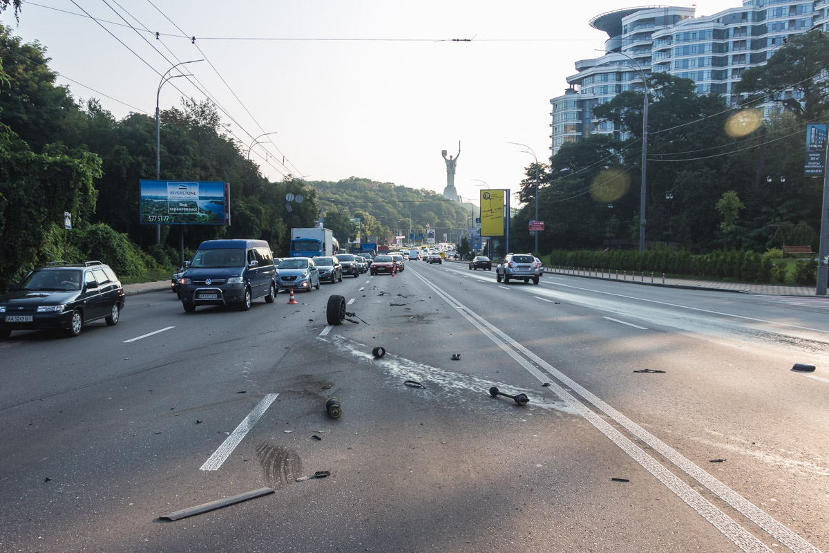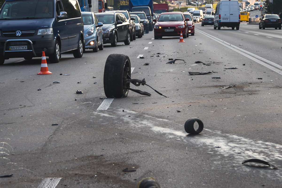 BMW і Peugeot рухалися з боку моста Патона в сторону станції метро «Либідська». Volkswagen рухався в протилежному напрямку. На ходу у авто лопнуло і відірвалося колесо. Через це автомобіль вилетів на зустрічну смугу і вдарив дві проїжджаючі повз машини. У них спрацювали подушки безпеки.