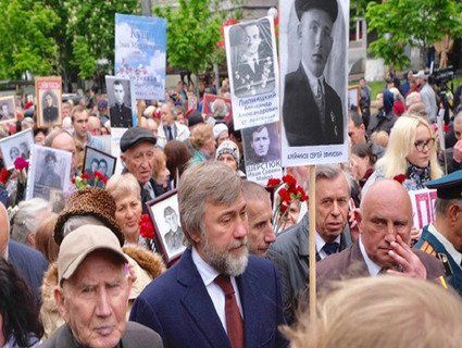 У Києві 9 травня пройшла проросійська акція "Безсмертний полк", на яку вийшло близько 600 учасників. Люди тримали в руках портрети учасників Другої світової війни. Біля Меморіалу вічної слави учасники акції скандували: "Фашизм не пройде!", а українські активісти вигукували: "Рашизм не пройде!" та "Серп і молот – смерть і голод!