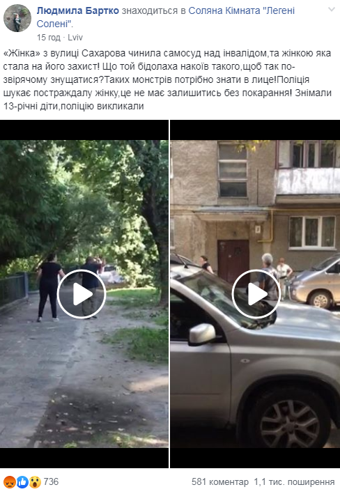 «Жінка» з вулиці Сахарова чинила самосуд над інвалідом та жінкою, яка стала на його захист! Що той бідолаха накоїв такого, щоб так по-звірячому знущатися? Таких монстрів потрібно знати в лице! Поліція шукає постраждалу жінку, це не має залишитись без покарання! Знімали 13-річні діти, поліцію викликали», – пише львів’янка.