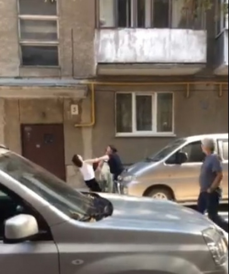 На цих кадрах видно, як жінка у чорному переслідує кволого чоловіка, очевидно, інваліда, виганяючи звідкись. При цьому поганяє людину, наче худобину, електрошокером. Коли за чолов’ягу заступається жінка у білій блузці, його кривдниця із великою силою пхає опонентку, від чого та падає на асфальт.
