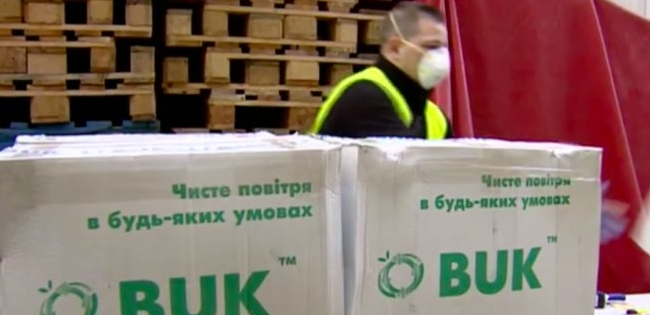 На кадрах видно, як кілька чоловіків розвантажують з машини коробки з логотипом "BUK" і слоганом "Чисте повітря в будь-яких умовах".