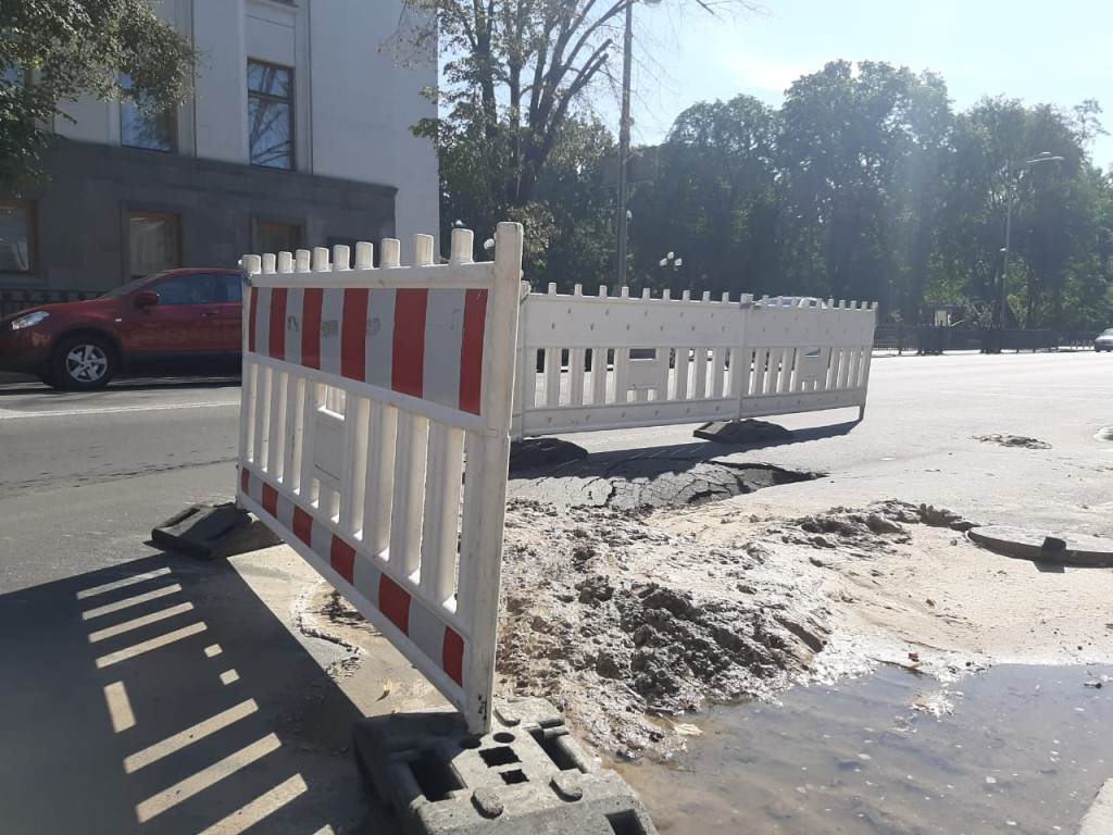 Зазначається, що аварія в інженерних мережах ПрАТ "АК"Київводоканал" призвела до пошкодження дорожнього покриття на вулиці Михайла Грушевського, 20, біля повороту на вулицю Шовковичну. В результаті аварії на проїжджій частині утворився провал.
