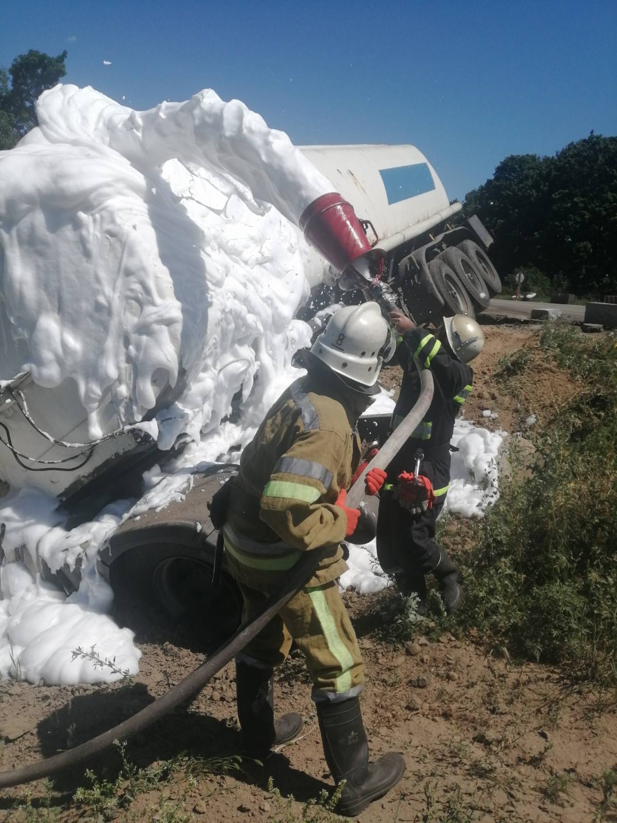 На відео видно, як рятувальники поливають вантажівку вогнегасильною піною та водою. Аби підняти цистерну, довелось задіяти підйомний кран.