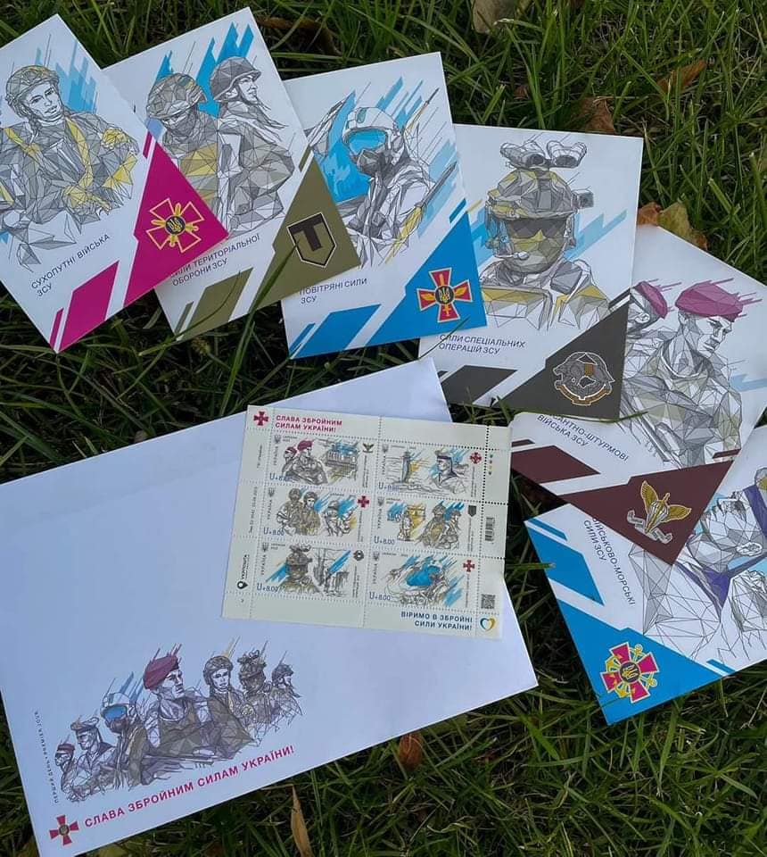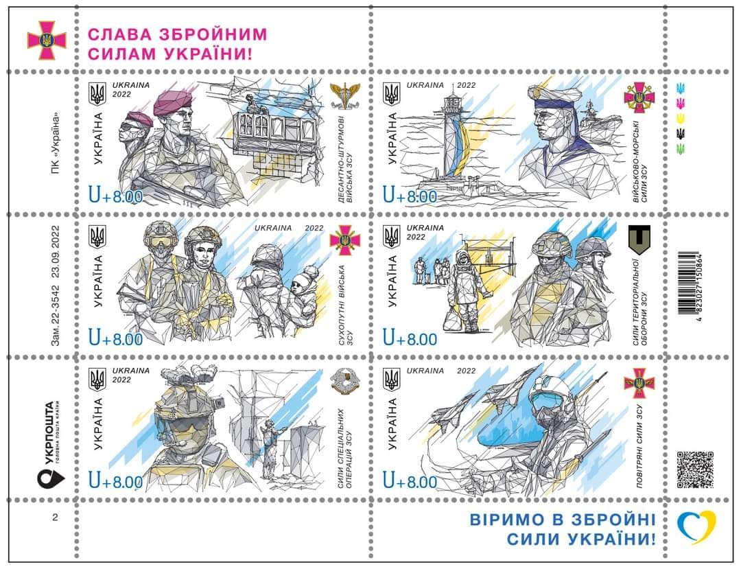 Поштові марки з додатковим номіналом нової серії «Слава Збройним силам України!» випустили на знак вшанування мужніх оборонців нашої держави, які гідно несуть службу, віддано та безстрашно боронять нашу українську землю від ворожої навали, а також тих, хто віддав своє життя, захищаючи суверенітет і територіальну цілісність нашої держави.