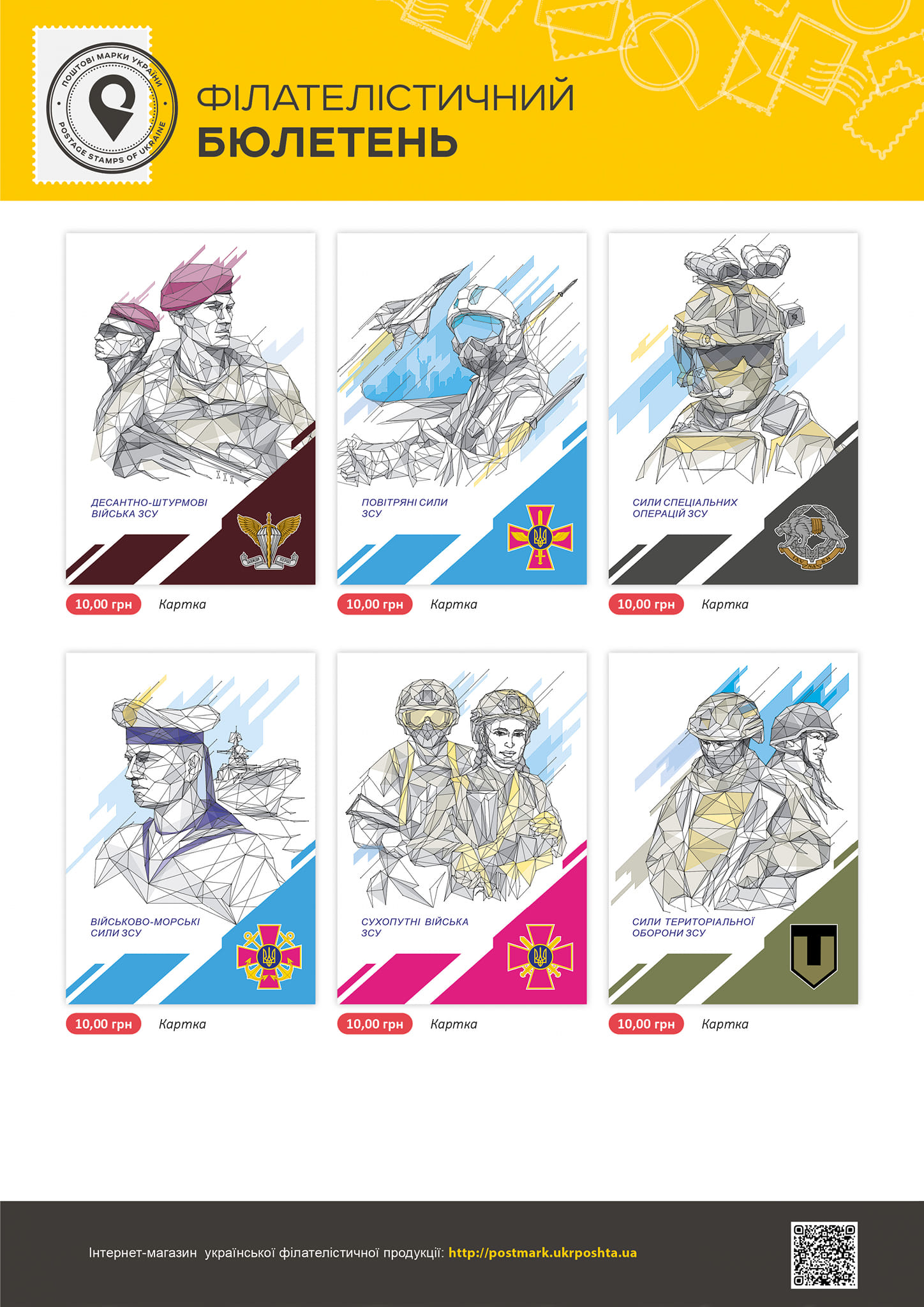 Також буде випущено конверт «Перший день» із образами військовослужбовців ЗСУ, 6 немаркованих художніх конвертів та шість листівок, присвячених кожному виду й роду військ, представленому на марках.